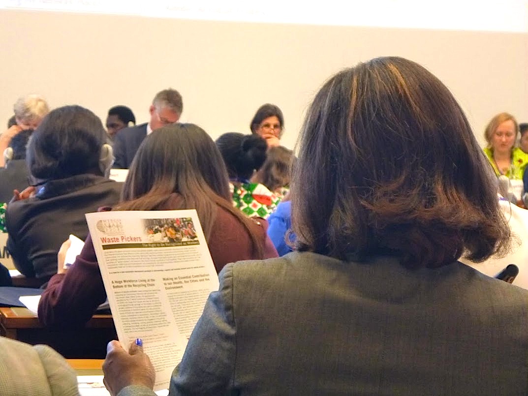 The waste pickers’ delegation also participated in several side meetings, events, and trainings that WIEGO organized. Included in the side meetings was a session about the ILO’s origins, the Conference as a process that involves governments, workers and employers from 185 countries, and the ILO as an international organization with its head office based in Geneva. They met with the Cooperative Branch at the ILO’s Enterprises Department, as well as the Sectoral Activities Department, which is now working with e-waste cooperatives and representatives from ILO’s ACTRAV, The delegates distributed many waste picker-related publications prepared by WIEGO, as well as a recent report on e-waste in Delhi, published by Chintan. Others included a report on job creation through recycling in the US by the Global Alliance for Incinerator Alternatives (GAIA).