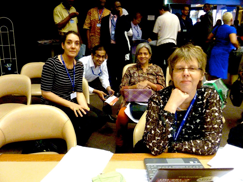 WIEGO saw this year’s theme as an opportunity for the waste pickers’ sector – one that has represented an integral but unrecognized green livelihood for decades – to finally participate in the ILO Conference. It invited some of the oldest and strongest waste pickers’ organizations in the world to join its delegation to learn about the internal ILO process and establish their presence for the first time at the Conference. Those organizations were KKPKP (India), ARB (Colombia) and MNCR (Brazil). Together with WIEGO colleagues, the delegates actively participated in the discussions that took place between June 5th and 20th in Geneva and engaged in discussions with other groups and key players. Prior to the visit, WIEGO European Advisor Karin Pape, together with Lucia Fernandez, WIEGO Waste pickers’ Program Coordinator, intensively planned the delegation’s agenda and consulted with ILO staff, the International Trade Union Confederation (ITUC), the ILO’s Bureau for Workers’ Activities (ACTRAV) and other actors. This laid the ground for the WIEGO delegation to be an integrated part of the workers’ group at the ILC as well as being well received by many ILO departments and key actors.