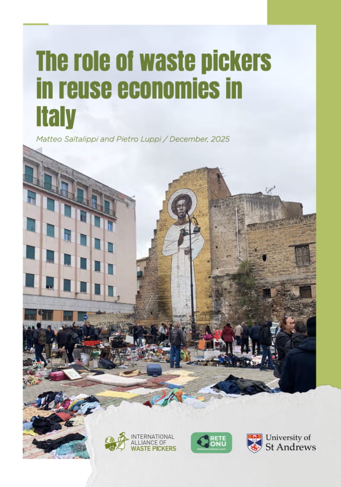 This report examines the crucial but often overlooked role of waste pickers in Italy’s reuse economy. Through field research conducted in flea markets in Turin, Rome, and Palermo, the study reveals how thousands of informal workers recover discarded goods and reintroduce them into local markets, preventing large volumes of materials from becoming waste. The research estimates that between 60,000 and 70,000 waste pickers in Italy collectively sell 197,000–230,000 tons of reused goods each year, highlighting their significant environmental and economic contributions.